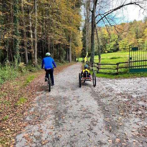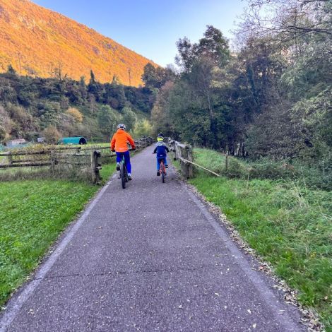Una volta lasciato il parco giochi ci siamo inoltrati nel bosco seguendo un tratto di sterrato che con calma siamo riusciti a fare tutti. Il silenzio e i primi colori autunnali ci hanno tenuto compagnia fino a quando ci siamo fermati ad ammirare il piccolissimo borgo di Villa d’Ogna, case completamente ristrutturate e vie strettissime per raggiungere un’azienda agricola della zona che ci ha fatto assaggiare i suoi prodotti a Km 0, Erran ha apprezzato molto mentre Ethan era più concentrato sui gatti e le galline. Abbiamo ripreso il giro seguendo il corso del fiume per rientrare nuovamente nel bosco e raggiungere Clusone.
