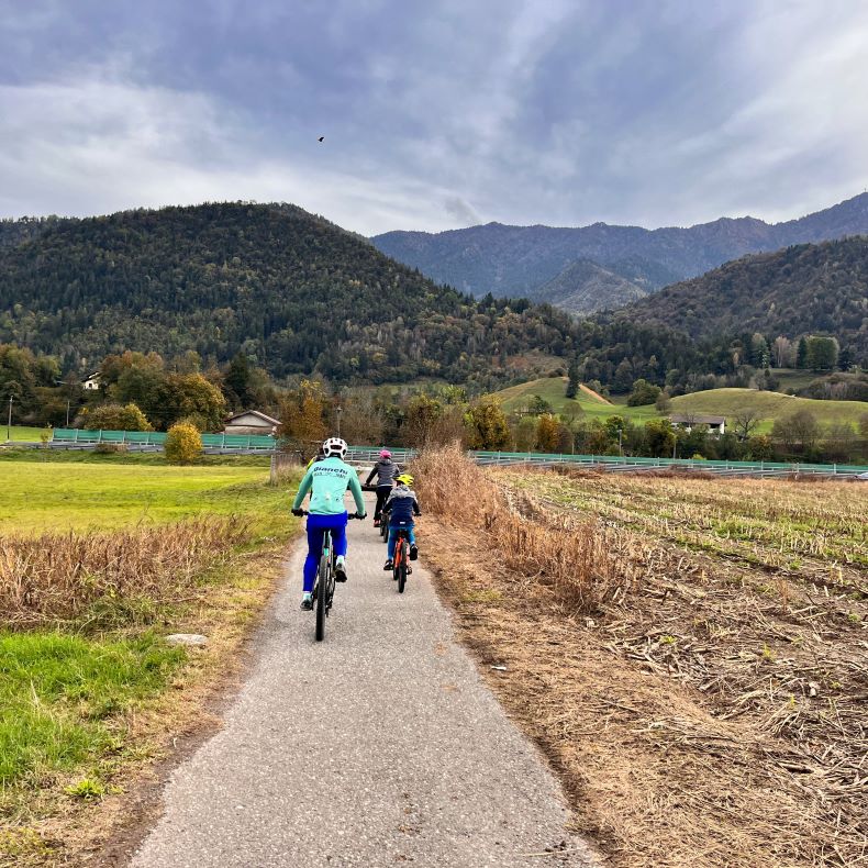 Una volta lasciato il parco giochi ci siamo inoltrati nel bosco seguendo un tratto di sterrato che con calma siamo riusciti a fare tutti. Il silenzio e i primi colori autunnali ci hanno tenuto compagnia fino a quando ci siamo fermati ad ammirare il piccolissimo borgo di Villa d’Ogna, case completamente ristrutturate e vie strettissime per raggiungere un’azienda agricola della zona che ci ha fatto assaggiare i suoi prodotti a Km 0, Erran ha apprezzato molto mentre Ethan era più concentrato sui gatti e le galline. Abbiamo ripreso il giro seguendo il corso del fiume per rientrare nuovamente nel bosco e raggiungere Clusone.