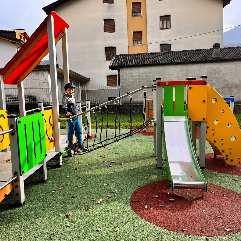 Iniziamo il nostro itinerario in biciletta vicino all’oratorio del paese dove si trova un parcheggio molto comodo per montare le biciclette, ci accompagna Franco titolare di e-bike tour, una guida bravissima del posto che ci fornisce anche le biciclette. La prima sosta la facciamo alla periferia di Clusone dove è stato costruito un piccolo parco giochi inclusivo, questo significa che alcuni giochi non hanno barriere architettoniche ed anche i bambini in sedia rotelle ne possono usufruire. Sul momento Ethan non ha capito il senso delle rampe sullo scivolo ma poi provando ha capito la facilità di risalita. L’amministrazione inoltre ha predisposto dei tavoli per pic-nic più lunghi lateralmente in modo tale che passeggini e sedie a rotelle possano essere avvicinate senza problemi e agevolare le famiglie.