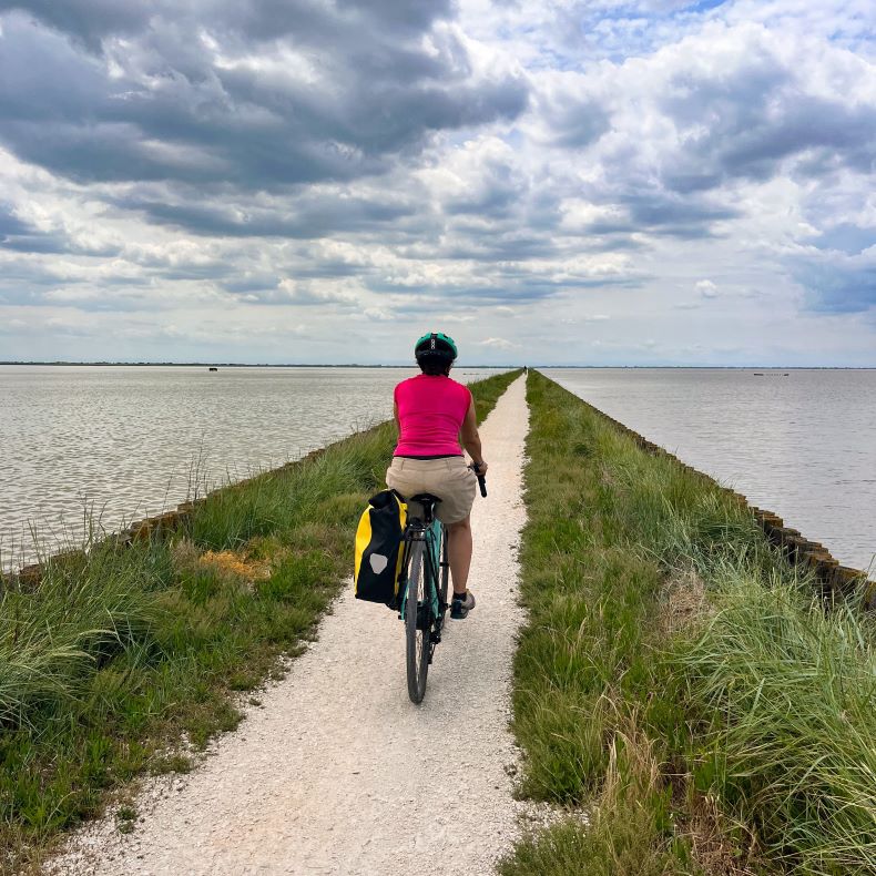 Da Ravenna a Lido di Spina si pedala quasi sempre su strada tranne il tratto che attraversa di nuovo le Valli di Comacchio.